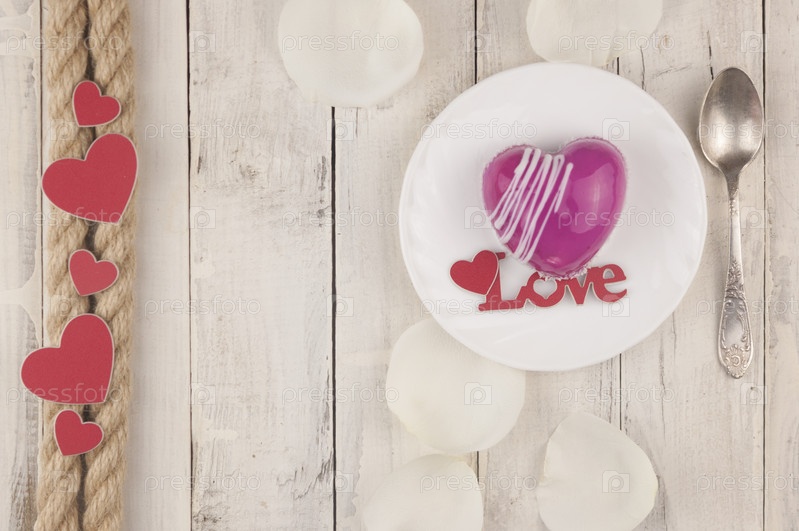 Слово любовь и белые лепестки розы с красным тортом в форме сердца на столе. Романтическое свидание