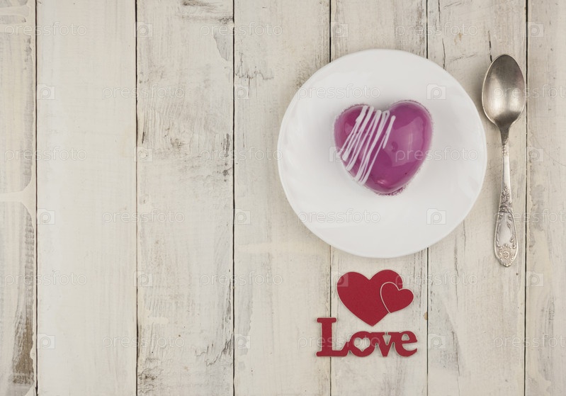 Слово любовь красный торт в форме сердца находится на белом деревянном столе. Романтическое свидание. завтрак. День рождения. Свадьба. Праздничный день