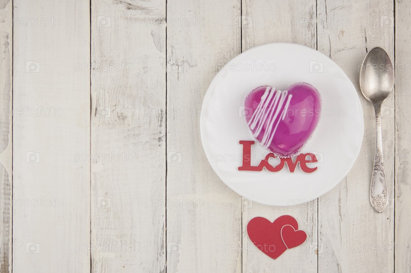 Слово любовь красный торт в форме сердца находится на белом деревянном столе. Романтическое свидание. завтрак. День рождения. Свадьба. Праздничный день