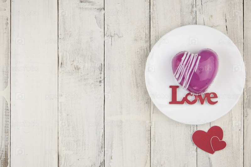 Слово любовь красный торт в форме сердца находится на белом деревянном столе. Романтическое свидание. завтрак. День рождения. Свадьба. Праздничный день