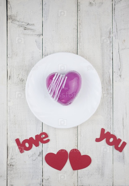 Слово любовь красный торт в форме сердца находится на белом деревянном столе. Романтическое свидание. завтрак. День рождения. Свадьба. Праздничный день
