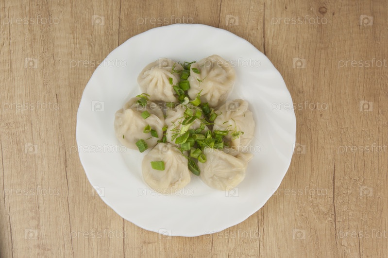 Хинкали на белой тарелке с зеленым луком