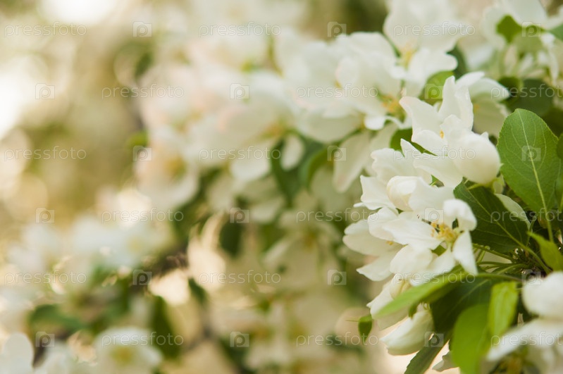 Ветка яблони с белыми цветами на фоне цветущих деревьев. Копировать пространство