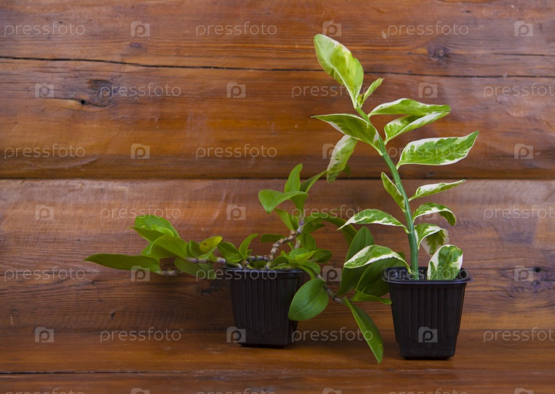 Комнатное растение с красивыми узорчатыми листьями в черном горшке на деревянном столе. Натуральная текстура, вид спереди. Внутреннее садоводство