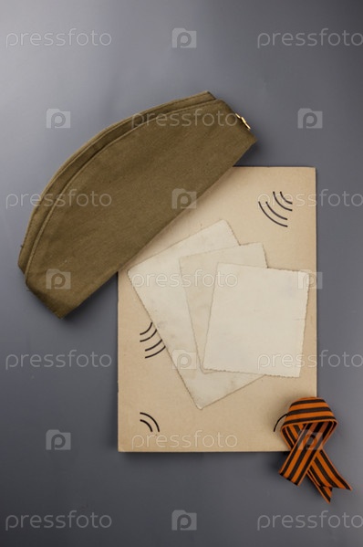 9 мая день победы праздничный фон. Георгиевская лента и военная фуражка - традиционный символ Дня Победы 1945 года. Дизайн поздравительной открытки. копировать пространство