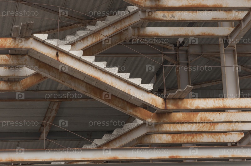 Низкий угол обзора строящегося здания с незавершенными бетонными лестницами и защитной сеткой на строительной площадке, которая может выдерживать сильные рывки