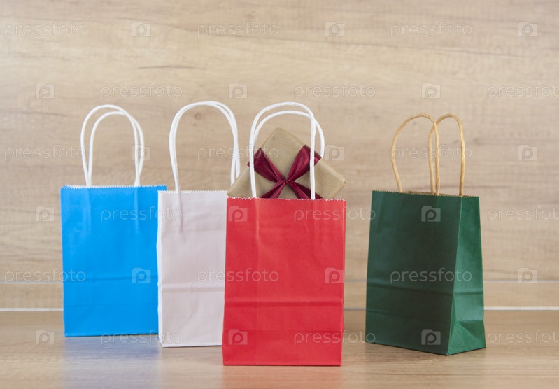 Красочные бумажные сумки для покупок на полу на фоне деревянной стены