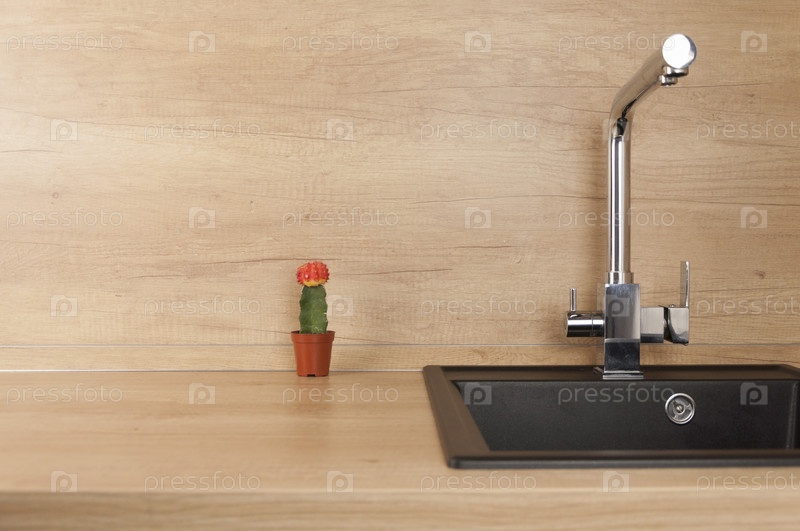 Черная кухонная раковина и водопроводная вода на кухне. Интерьер кухонного помещения квартиры. Встроенная техника. Кухонный прибор