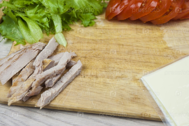 Бутерброд с ветчиной, сыром, помидорами, листьями салата и поджаренным хлебом. Вид сверху на белом фоне