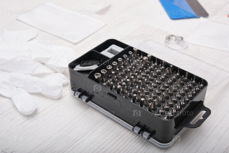 Крупный план набора отверток в черной коробке, перчаток, сломанного смартфона и набора инструментов для замены стекла телефона и планшета