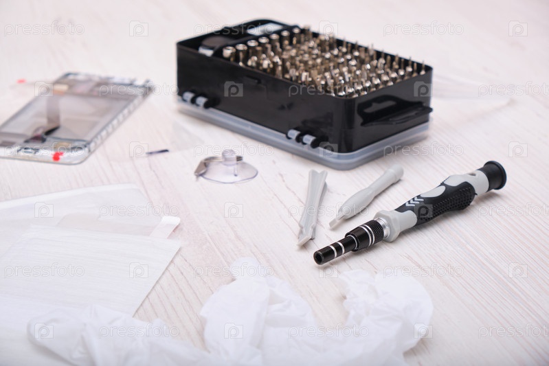 Набор отверток в черной коробке, перчатки, разбитый смартфон и набор инструментов для замены стекла телефона и планшета
