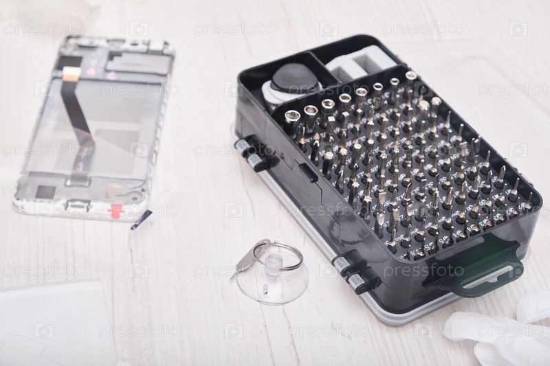 Крупный план набора отверток в черной коробке, перчаток, сломанного смартфона и набора инструментов для замены стекла телефона и планшета