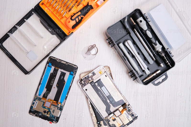 Мини-набор бит для отвертки в оранжевой коробке, набор для ремонта телефона и сломанного смартфона на деревянном столе, пространство для копирования сверху