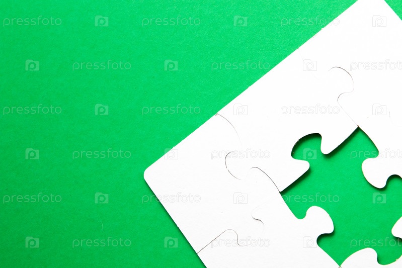 Незаконченная головоломка из белого картона на зеленом фоне и одна неподходящая часть от другой головоломки, одна часть отсутствует, место для копирования