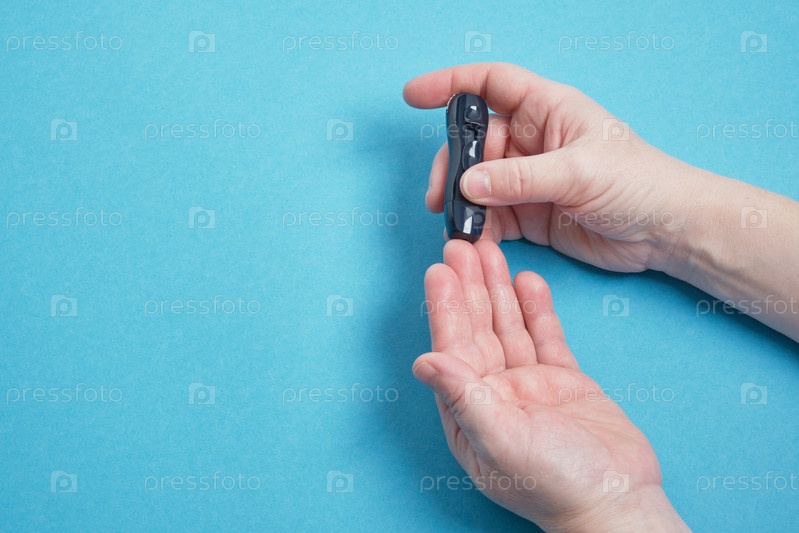 Рука женщины с помощью ланцета на пальце, чтобы проверить уровень сахара в крови с помощью глюкометра, диабета, гликемии, концепции здравоохранения