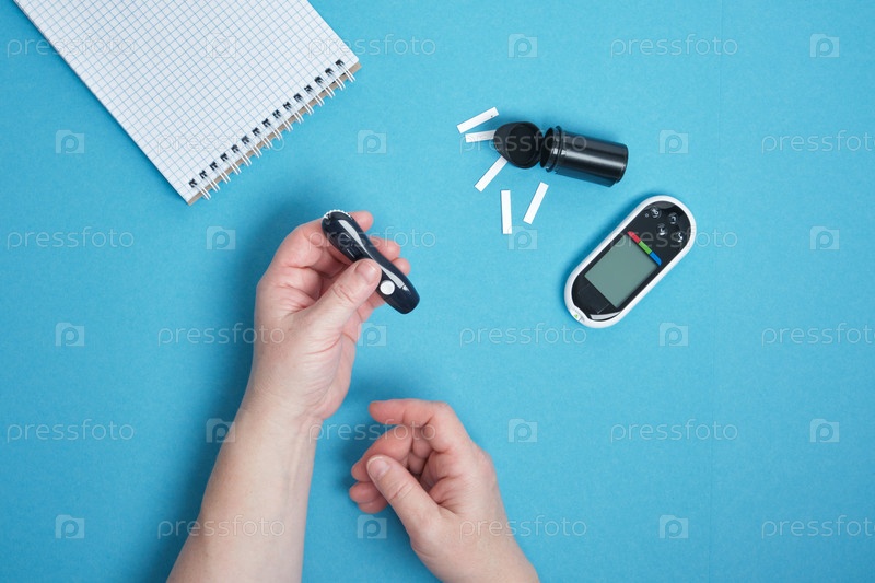 Рука женщины с помощью ланцета на пальце, чтобы проверить уровень сахара в крови с помощью глюкометра, диабета, гликемии, концепции здравоохранения