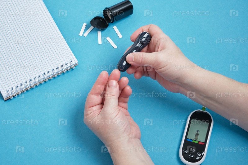 Рука женщины с помощью ланцета на пальце, чтобы проверить уровень сахара в крови с помощью глюкометра, диабета, гликемии, концепции здравоохранения. синий фон копия пространства вид сверху