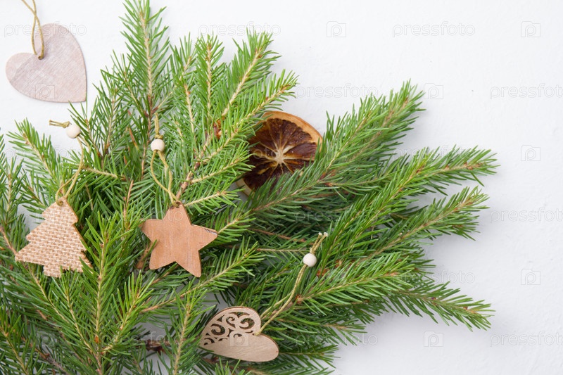 Елочные игрушки и натуральные еловые ветки на белом фоне вид сверху копия места, самодельные экологически чистые елочные игрушки на свежих еловых ветках