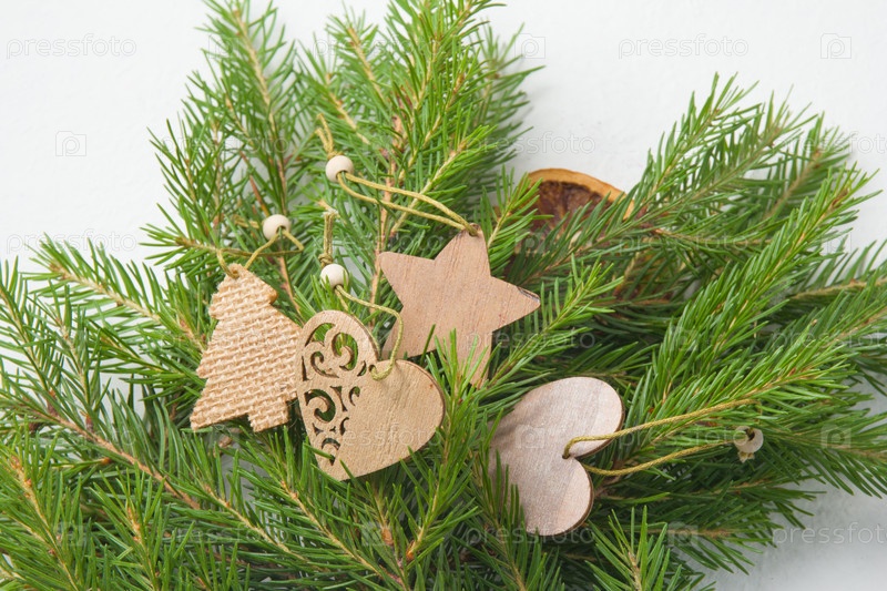 Елочные игрушки и натуральные еловые ветки на белом фоне вид сверху копия места, самодельные экологически чистые елочные игрушки на свежих еловых ветках