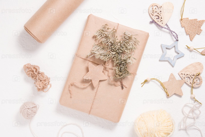 Экологически чистая упаковочная коробка на рождество или новый год, деревянные рождественские украшения, коробка, завернутая в крафт-бумагу с еловой веткой и деревянным сердцем на белом фоне