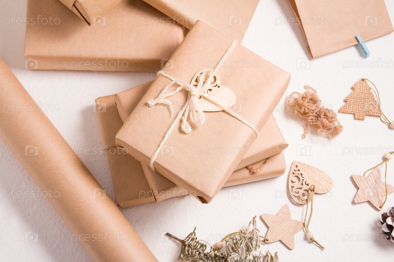 Обертки для рождественских подарков в эко-стиле, несколько подарочных коробок, украшенных деревянными елочными игрушками, сухая еловая ветка, белый фон, безотходный образ жизни