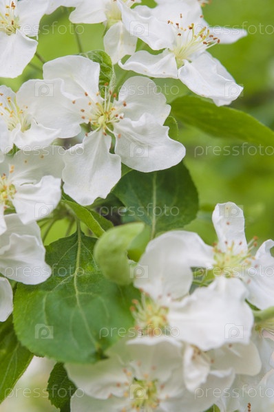 Яблоневые цветы на фоне зеленых листьев. Весенние цветущие фруктовые деревья. Весна, цветущий сад