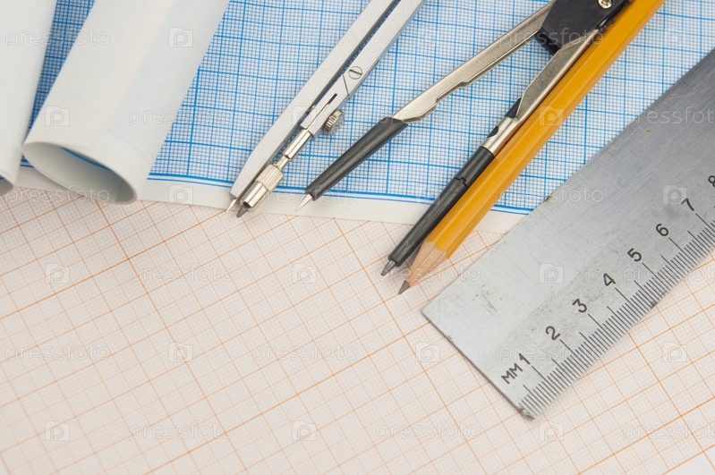 Математические инструменты над углом математической миллиметровки с копией пространства для текста. Концепция математических графических инструментов