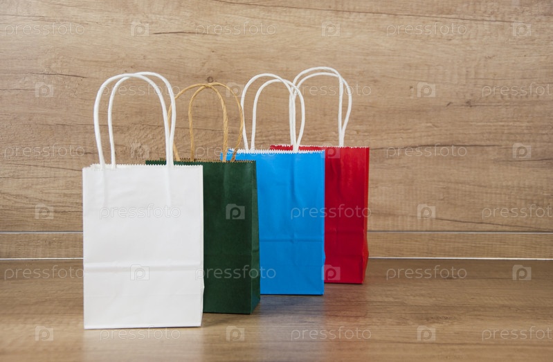 Красочные бумажные сумки для покупок на полу на фоне деревянной стены