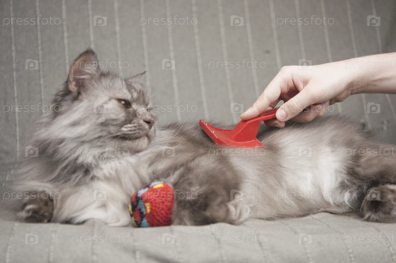 Расчесывание милой милой серой длинношерстной кошки. Пушистый кот любит, когда его расчесывают