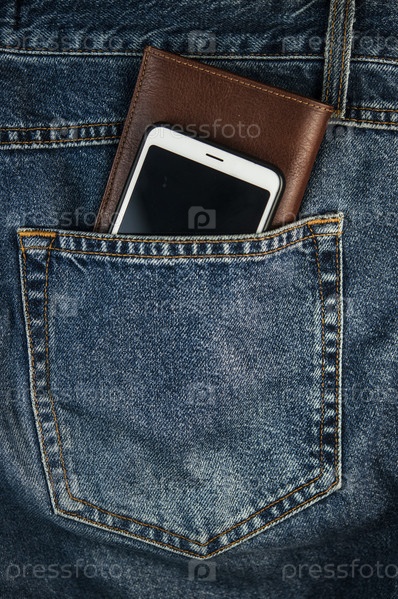 Смартфон и коричневый кожаный кошелек, задний карман синих потертых джинсов, хипстерский современный стиль жизни для вставки текста