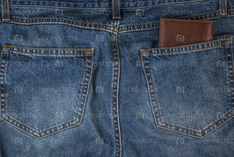 Коричневый кожаный кошелек задний карман синих потертых джинсов хипстер современный стиль жизни макет для вставки текста