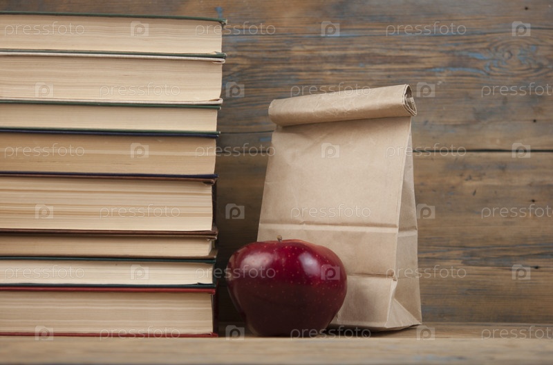 Стопка книг, красное яблоко, шероховатый деревянный фон, свободное место для копирования