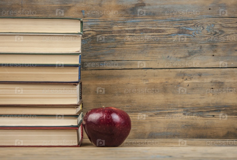 Стопка книг, красное яблоко, шероховатый деревянный фон, свободное место для копирования
