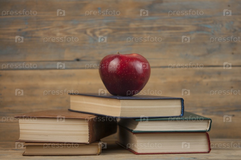 Стопка книг, красное яблоко, шероховатый деревянный фон, свободное место для копирования
