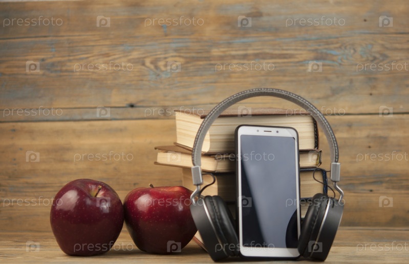 Стопка книг с красным яблоком и цифровым планшетом, наушники на деревянном столе с доской