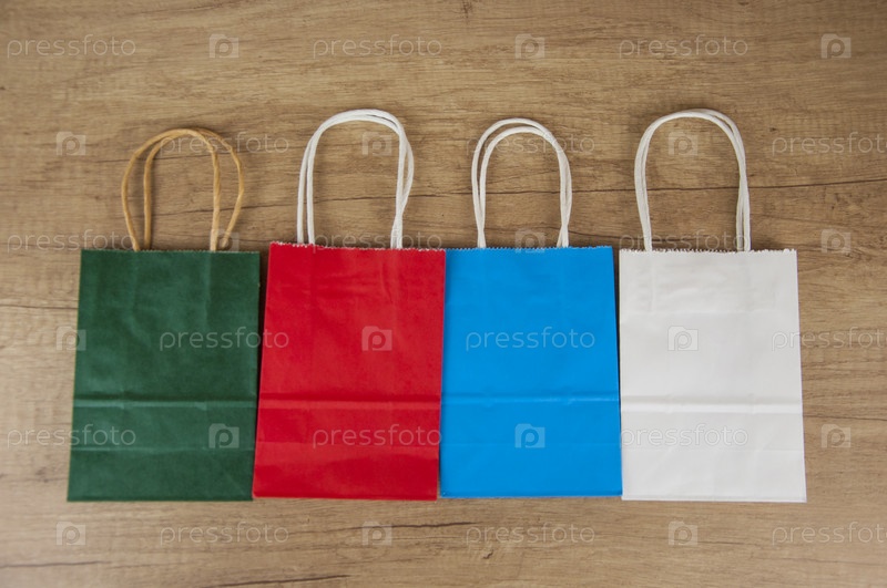 Красочные бумажные сумки для покупок на полу на фоне деревянной стены