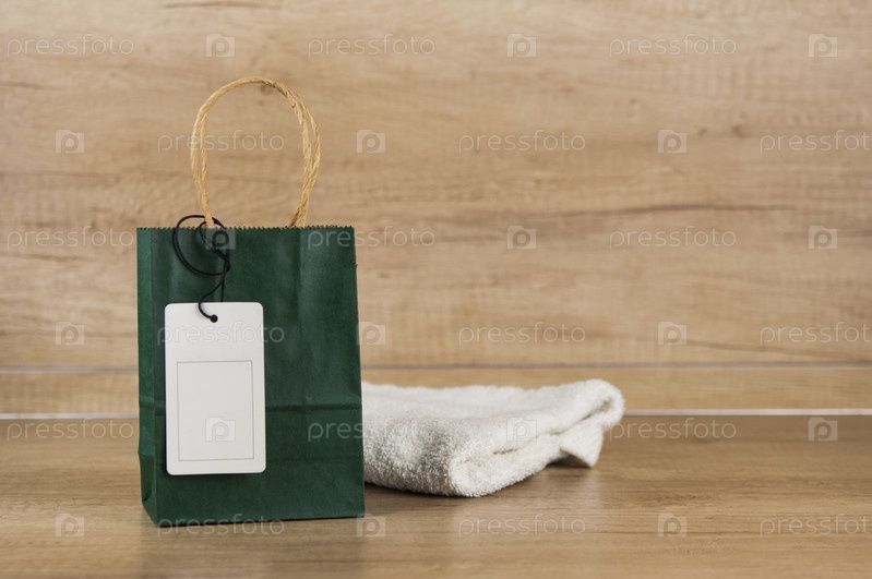 Сумка для покупок с пустой биркой на деревянном столе у деревянной стены