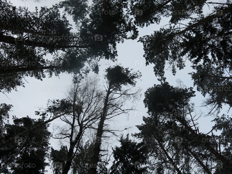 Кроны сосен и елей в темнеющем осеннем лесу, снятые снизу