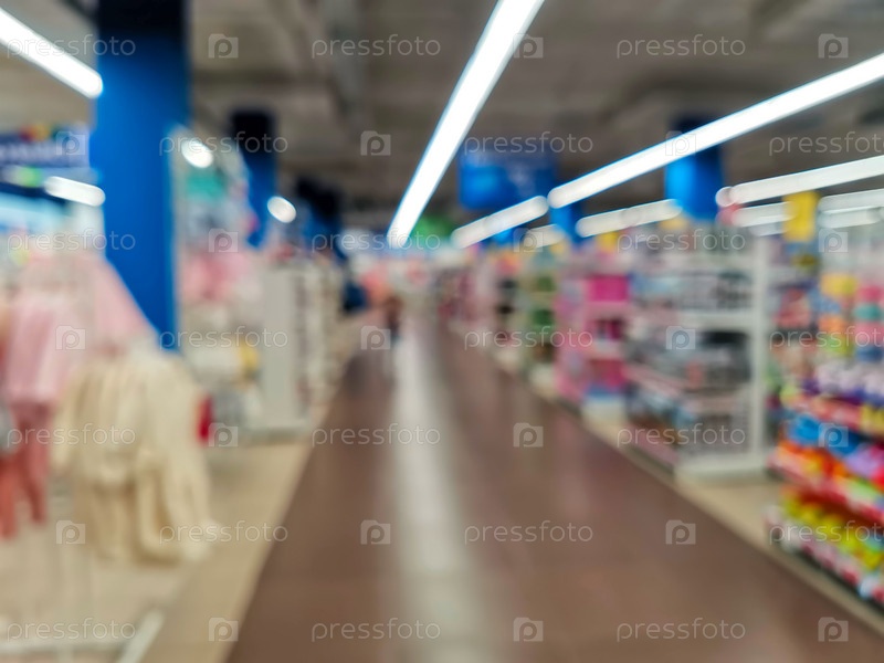 Абстрактное размытие пустого прохода магазина со скидкой в супермаркете и интерьер полки с товаром расфокусированным фоном., Абстрактное размытие пустого прохода со скидкой в супермаркете и интерьера стеллажа с расфокусированным фоном