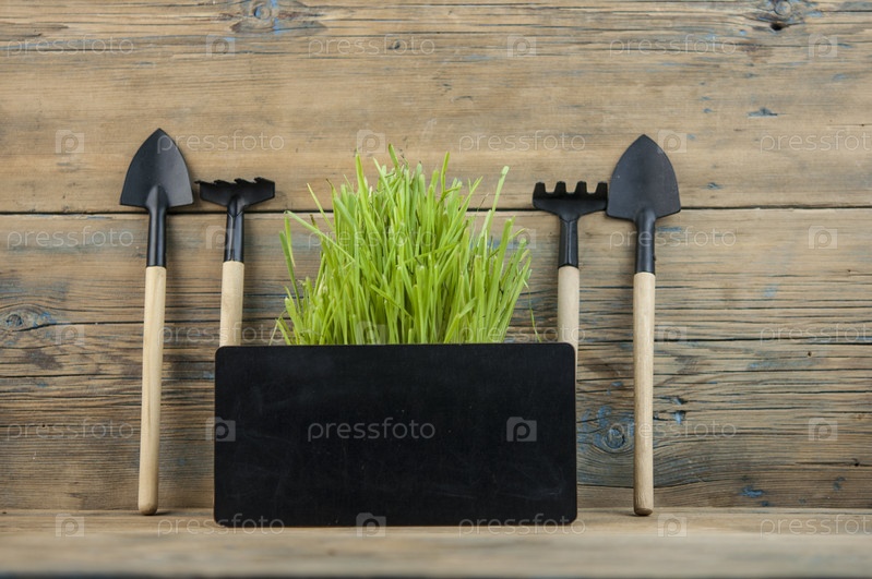 Инвентарь садовника, лопата, грабли, растут вместе с зеленой травой на белом фоне. Концепция весны и начало садоводства. Место для текста