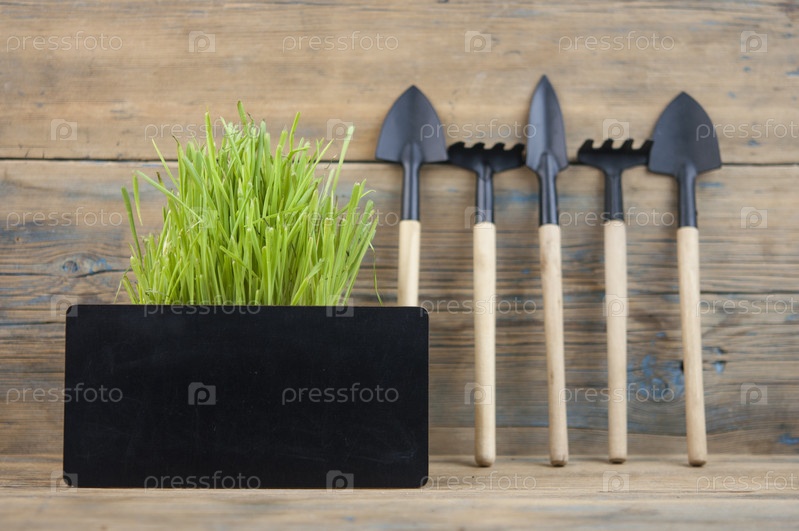 Инвентарь садовника, лопата, грабли, растут вместе с зеленой травой на белом фоне. Концепция весны и начало садоводства. Место для текста