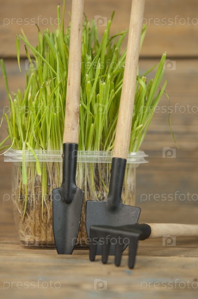 Инвентарь садовника, лопата, грабли, растут вместе с зеленой травой на белом фоне. Концепция весны и начало садоводства. Место для текста