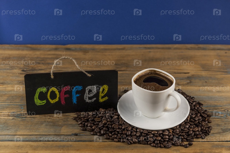 Чашка кофе и доска с надписью «кофе», написанная красочным алфавитом. Перерыв на кофе, концепция утреннего пробуждения