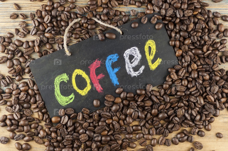 Куча кофейных зерен и доска с надписью «кофе», написанной красочным алфавитом. Перерыв на кофе, концепция пробуждения по утрам