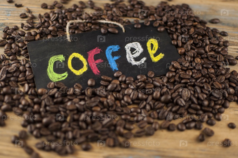 Куча кофейных зерен и доска с надписью «кофе», написанной красочным алфавитом. Перерыв на кофе, концепция пробуждения по утрам