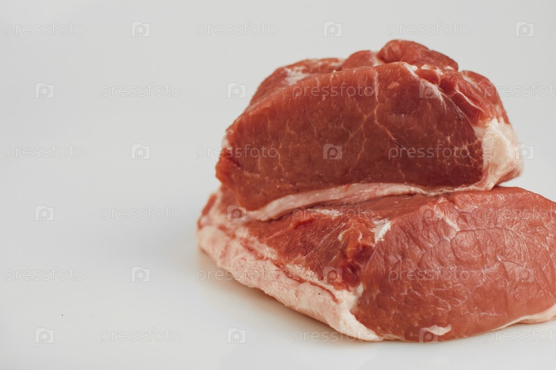 Большие куски сырой свиной шеи на белом фоне. крупный план, пространство для копирования
