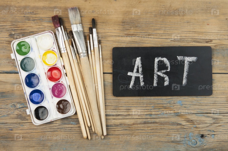 Акварельный поддон, набор кистей для рисования, на деревянном фоне, плоская планировка