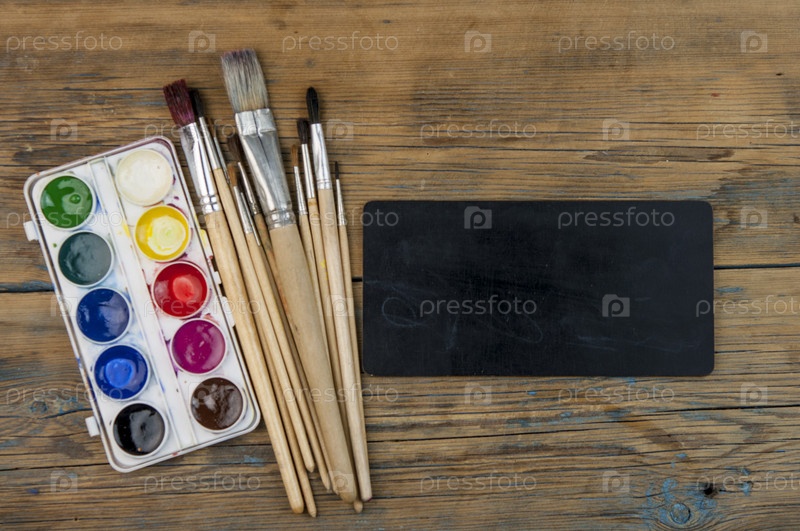 Акварельный поддон, набор кистей для рисования, на деревянном фоне, плоская планировка