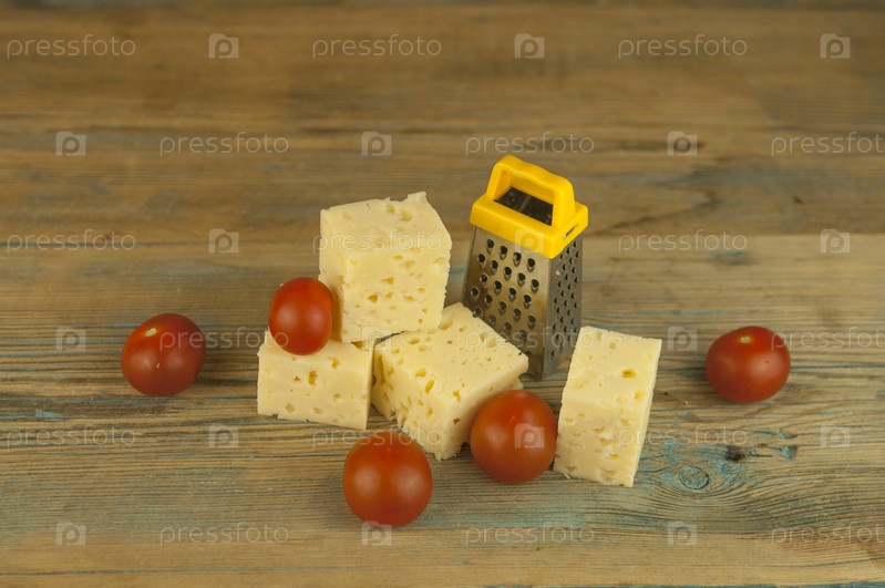 Сложите кубики сыра и помидоры черри с миниатюрной теркой на деревянный кухонный стол