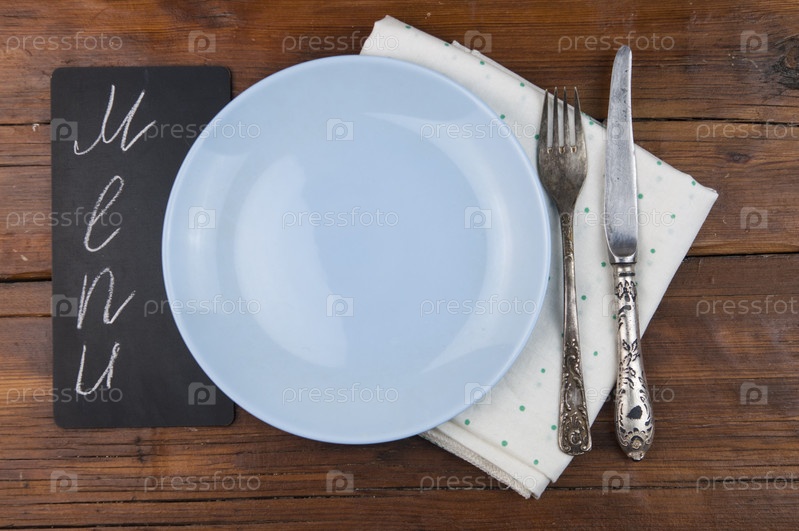 Меню написано мелом на старой доске с кухонной утварью на деревянном столе